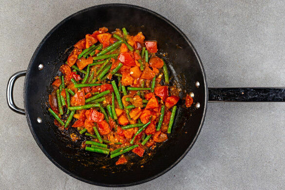 Die Tomaten und die Bohnen in einer großen Pfanne mit 4EL Olivenöl bei mittlerer bis starker Hitze 7–9Min. braten, dabei die Tomaten mit einem Kochlöffel leicht zerdrücken. Den Knoblauch schälen und fein würfeln, unter das Gemüse rühren und weitere ca. 2Min. mitbraten.