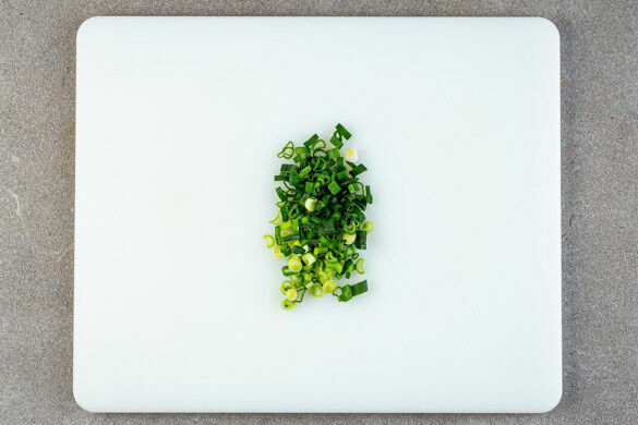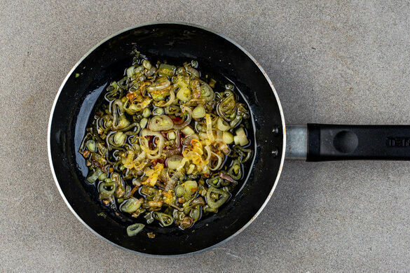 Die Lauchzwiebeln in feine Ringe schneiden. Die Pasta mit dem Gemüse und der Sauce in der Pfanne vermengen und auf tiefe Teller verteilen. Mit den Schalotten und den Lauchzwiebeln garnieren und servieren.