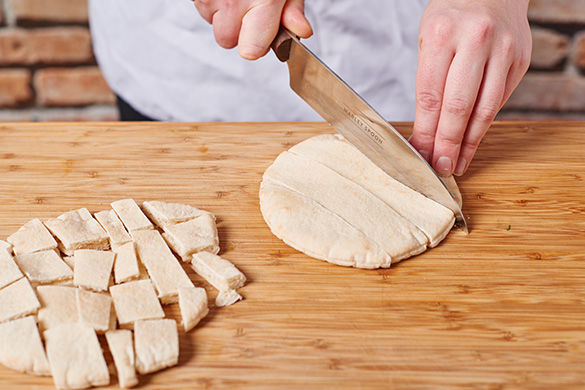 Brot aus der Packung nehmen und in ca. 2cm große Stücke schneiden.