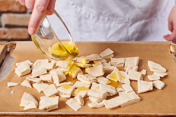 Brotstücke auf ein mit Backpapier ausgelegtes Backblech geben, mit Salz, Pfeffer und 2EL Öl besprenkeln, gut vermengen und auf dem Blech verteilen. Im Ofen ca. 5Min. goldbraun und knusprig backen.
