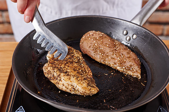 Inzwischen das Fleisch trocken tupfen, mit Salz und Pfeffer würzen und mit dem Za'tar bestreuen. Das Za'tar gut an das Fleisch drücken.