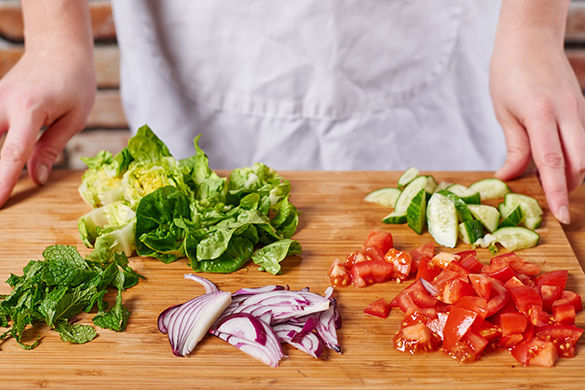 Ofen auf 200°C Umluft vorheizen. Strunk vom Salat entfernen und in mundgerechte Stücke schneiden. Gurke und Tomaten ebenso in mundgerechte Stücke schneiden. Zwiebel schälen, halbieren und in feine Streifen schneiden. Minze ohne harte Stiele grob hacken.