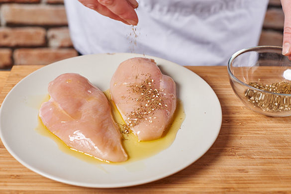 Inzwischen das Fleisch trocken tupfen, mit Salz und Pfeffer würzen und mit dem Za'tar bestreuen. Das Za'tar gut an das Fleisch drücken. Wenn die Kinder kein Za'ater mögen, das Fleisch einfach mit Salz und Pfeffer würzen.
