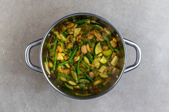 Den Knoblauch und den Lauch in einem großen Topf mit 2EL Olivenöl und der italienischen Gewürzmischung bei mittlerer Hitze ca. 2Min. anbraten. 400–500ml Wasser angießen, das Brühgewürz einrühren und die weißen und die grünen Bohnen zugeben. Zum Kochen bringen und abgedeckt ca. 5Min. köcheln lassen. Die Zucchini zugeben und den Eintopf ca. 5Min. weiterköcheln.