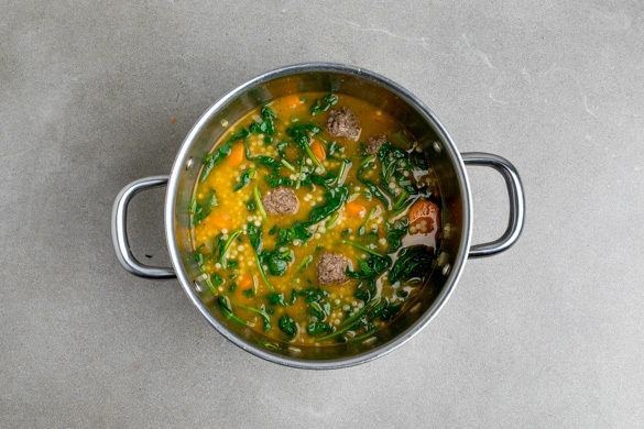 Die Hackbällchen mit dem ausgetretenen Bratensatz vorsichtig in den Eintopf rühren und ca. 2Min. sanft mitköcheln lassen, bis der Perlencouscous gar ist.