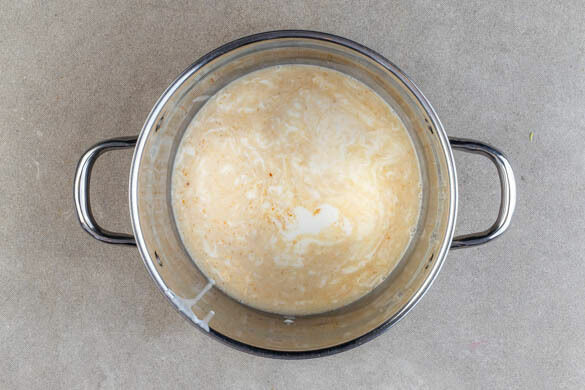 In einem kleinen Topf die Kokosmilch, 100ml Wasser, die ½ der Gewürzmischung und 1 kräftige Prise Salz zum Kochen bringen.