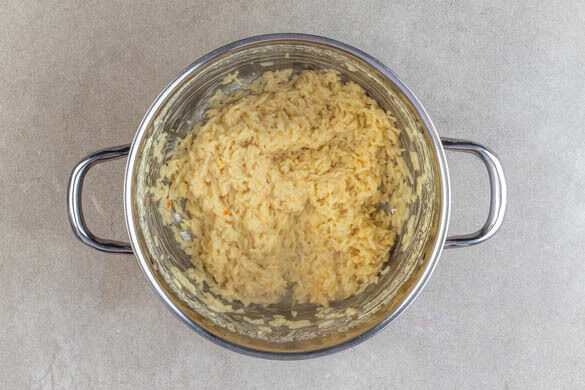 Den Reis in einem Sieb kalt abspülen, bis das Wasser klar bleibt. Sobald das Wasser kocht, den Reis hineingeben und abgedeckt bei niedrigster Hitze 10–12Min. kochen, bis das Wasser aufgesogen und der Reis gar ist. Noch ca. 5Min. ohne Hitzezufuhr ziehen lassen.