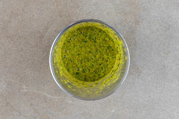 Den Knoblauch schälen und fein würfeln. Das Basilikum und die Petersilie grob schneiden. Die Peperoni in Ringe schneiden. Alle genannten Zutaten in einem hohen Gefäß mit 4EL Olivenöl, 4EL hellem Essig, 6EL Wasser, 1TL Oregano, der restlichen Gewürzmischung und 2 kräftigen Prisen Salz bis zur gewünschten Konsistenz pürieren. Mit Salz, Öl und Essig abschmecken.