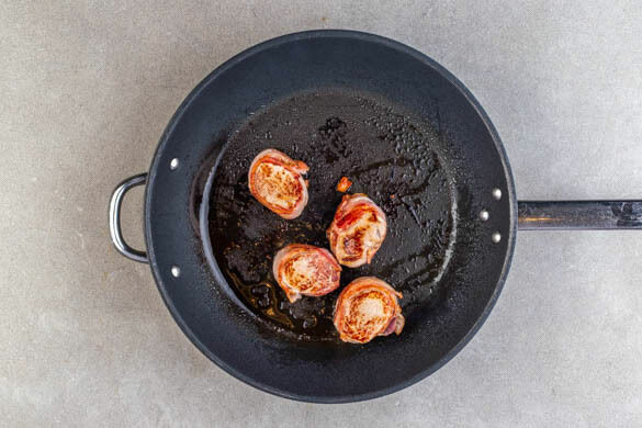Die Baconscheiben leicht überlappend auslegen. Das Fleisch trocken tupfen, quer auf den Bacon legen und einrollen. In je 4 gleich dicke Scheiben schneiden.
