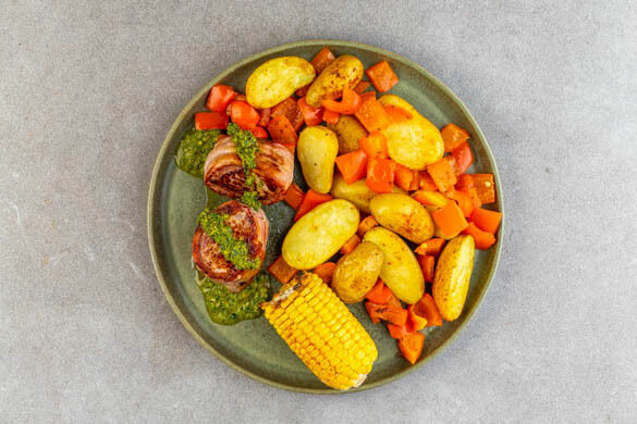 Soll es heute mal etwas ganz Besonderes sein? Wir haben da einen Vorschlag: zartes Schweinefilet, eingehüllt in leckeren Bacon und dann herrlich knusprig gebraten, verfeinert mit der würzigen Magie der Chimichurri. Klingt hervorragend, oder? Für kulinarisch hochwertige Farbe auf dem Teller sorgen Kartoffeln, Paprika und Mais – raffiniert gewürzt und schick im Ofen gebacken. Ein zauberhaftes Mahl, ebenso deftig wie exklusiv!