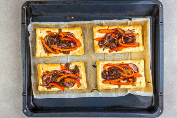 Den Teig mit dem Papier nach unten auf einem Backblech ausrollen und in 4 Rechtecke schneiden. Den Teig an den Rändern ca. 1cm einschlagen und den Belag gleichmäßig auf den Teigstücken verteilen, dabei die Ränder aussparen.