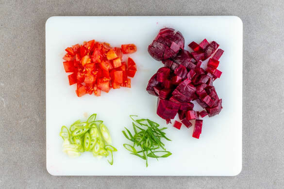 Die Tomate in ca. 1cm große Würfel schneiden. Die ½ der Roten Bete ggf. abgießen und in ca. 1cm große Würfel schneiden. Tipps: Da Rote Bete stark färbt, beim Verarbeiten am besten Küchenhandschuhe und Schürze tragen. Wer mag, kann auch mehr Rote Bete verwenden. Den weißen Teil und den grünen Teil der Lauchzwiebel getrennt leicht schräg in feine Ringe schneiden.