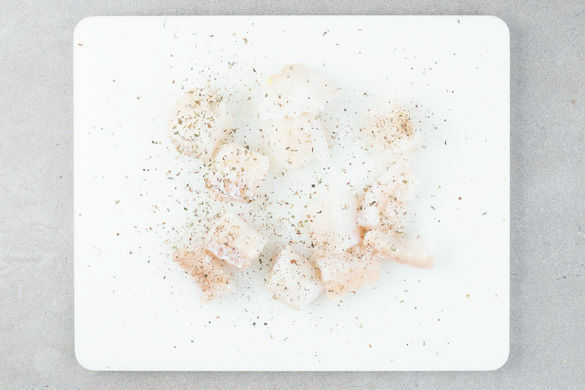 Den Fisch mit kaltem Wasser abspülen, trocken tupfen und evtl. vorhandene Gräten mit einer Pinzette entfernen. Die Fischstücke mit 2–3 Prisen Gewürzmischung sowie Salz und Pfeffer würzen.