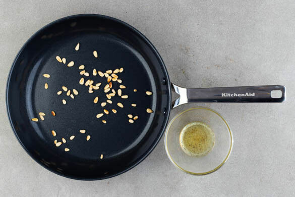 Die Pinienkerne in einer kleinen Pfanne ohne Fett bei mittlerer Hitze 1–2Min. goldbraun anrösten. 1 Zitronenhälfte auspressen. 2EL Zitronensaft mit 2EL Olivenöl, 1TL Honig sowie je 1 kräftigen Prise Salz und Pfeffer verrühren und mit dem Spinat und den Pinienkernen vermengen. Die Pastillas in Stücke schneiden und mit dem Salat servieren.