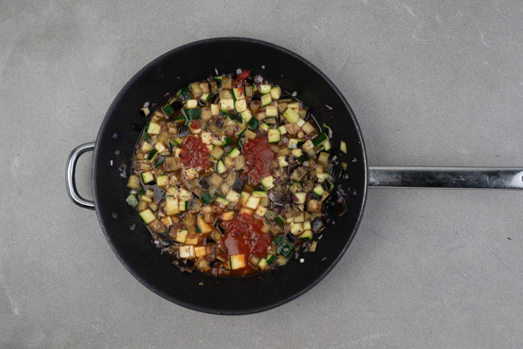 Den Knoblauch zum Gemüse in die Pfanne geben und die ½ des Tomatenmarks unterrühren. Mit der Brühe ablöschen und alles 5–6Min. sanft einköcheln lassen. Mit dem restlichen Brühgewürz, Salz, Pfeffer, 1 Prise Zucker und der Provence-Kräutermischung nach Belieben abschmecken.