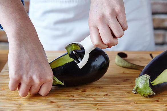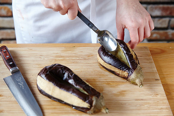Ofen auf 250°C Grill vorheizen. Von der Aubergine der Länge nach mit einem Sparschäler drei Streifen von oben nach unten abschälen. Nun die Auberginen auf ein mit Backpapier ausgelegtes Backblech legen und im Ofen ca. 10Min. garen, wenden und nochmals 10Min. grillen.