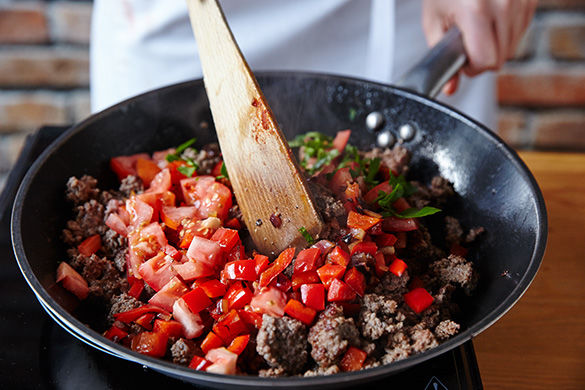 Gemüse aus der Pfanne nehmen und Pfanne auswischen. Dann mit 1EL Öl erneut auf mittelhohe Stufe erhitzen. Das Fleisch ca. 3-5Min. anbraten, großzügig mit Salz und Pfeffer sowie nach Geschmack mit dem Paprikapulver würzen. Pfanne von der Hitze nehmen und die Hälfte der Petersilie und Tomate unter das Fleisch heben.