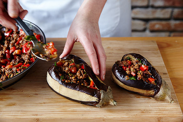 Auberginen gut mit Salz, Pfeffer und 2EL Öl würzen. Nun das Hackfleisch in die Auberginen füllen. Das angebratene Gemüse über dem Fleisch verteilen. Auberginen zurück in den Ofen geben und ca. 30-40Min. gar backen.