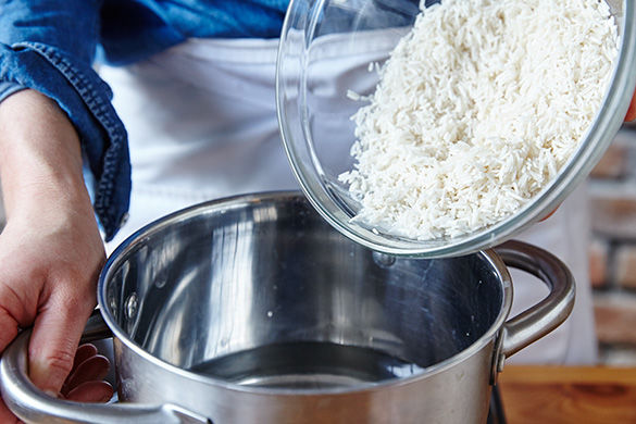Inzwischen mittleren Topf mit ausreichend gesalzenem Wasser zum Kochen bringen. Reis in das Wasser geben und ca. 10-12Min. leicht köchelnd bissfest garen. Dann das Wasser abgießen und Reis im Sieb abtropfen lassen. Reis mit Auberginen anrichten, restliche Petersilie darüber verteilen.