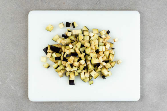 Inzwischen in einem kleinen Topf ausreichend Wasser für die Eier zum Kochen bringen. Die Auberginen in ca. 1cm große Würfel schneiden. Die Auberginenwürfel in einer großen Pfanne mit 3EL Pflanzenöl sowie je 1 kräftigen Prise Salz und Pfeffer bei mittlerer bis starker Hitze 5–7Min. weich braten, dabei gelegentlich umrühren.