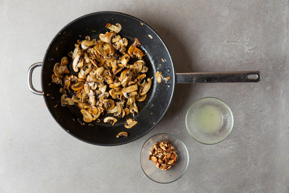 Die Pilze ggf. säubern und in dünne Scheiben schneiden. Zu den Schalotten in die Pfanne geben und ca. 5Min. braten, bis sie schön gebräunt sind. Nebenher die Zitronenschale abreiben, dann die Zitrone halbieren und auspressen. Die Rauchmandeln grob hacken.