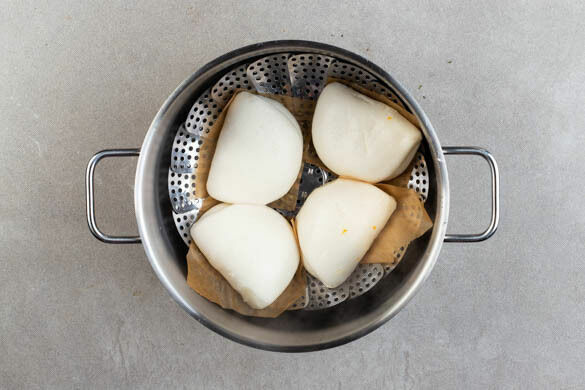 Einen großen Topf bis unter den Dämpfeinsatz mit Wasser füllen und das Wasser zum Kochen bringen. Tipp: Statt des Dämpfeinsatzes kann auch ein passendes Sieb verwendet werden. Den Dampfbehälter mit Backpapier auslegen, die Brötchen hineingeben und ca. 7Min. abgedeckt dämpfen, bis sie weich und fluffig sind. Die Brötchen ggf. in mehreren Durchgängen dämpfen. Vorsicht, heißer Dampf!