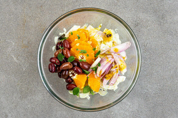 Den Fenchel vierteln und in hauchdünne Streifen schneiden, dabei den harten Strunk entfernen. Die Schalotte schälen, halbieren und in dünne Streifen schneiden. Die Orangen mit einem Messer schälen, dabei auch die weiße Haut entfernen. Das Fruchtfleisch in ca. 1cm breite Spalten schneiden. Die Zutaten mit den Oreganoblättern, den Oliven und dem Dressing vermengen.