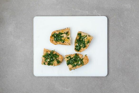 Den Knoblauch schälen und sehr fein würfeln oder durch eine Knoblauchpresse drücken. Die Petersilie samt Stängeln fein hacken. 2–3EL Olivenöl und je 1 Prise Salz und Pfeffer mit dem Knoblauch und der Petersilie verrühren. Das Brötchen halbieren und die Hälften quer teilen. Mit dem Kräuteröl bestreichen und auf einem mit Backpapier ausgelegten Blech im Ofen 7–9Min. backen.
