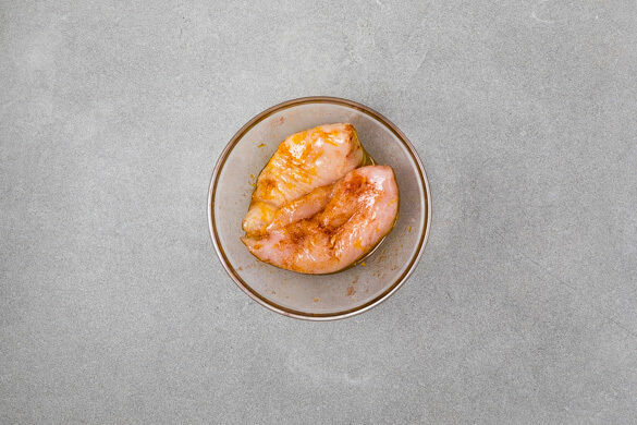 Das Fleisch trocken tupfen und längs halbieren. 2EL Olivenöl, 1–2TL Orangenschale, 1 kräftige Prise Salz und 2TL der Gewürzmischung oder mehr nach Geschmack zu einer Marinade verrühren. Das Fleisch mit der Marinade einreiben und beiseitestellen.