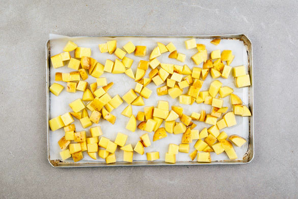 Den Backofen auf 240°C (220°C Umluft) vorheizen. Die Kartoffeln samt Schale in ca. 1cm große Würfel schneiden. Auf ein mit Backpapier ausgelegtes Backblech geben und mit 1EL Olivenöl vermengen.