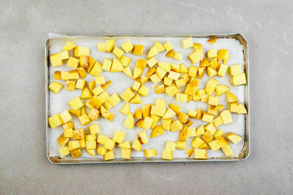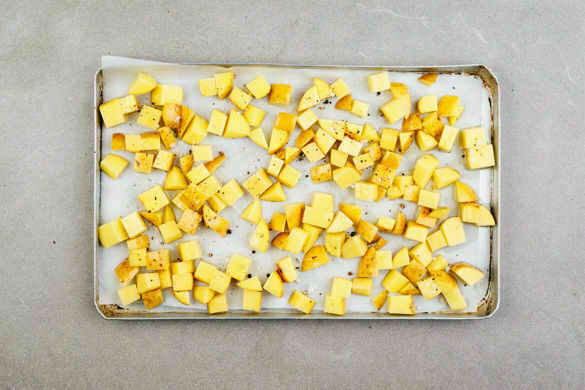 Den Backofen auf 240°C (220°C Umluft) vorheizen. Die Kartoffeln samt Schale in ca. 1cm große Würfel schneiden. Auf ein mit Backpapier ausgelegtes Backblech geben und mit 2EL Olivenöl vermengen.
