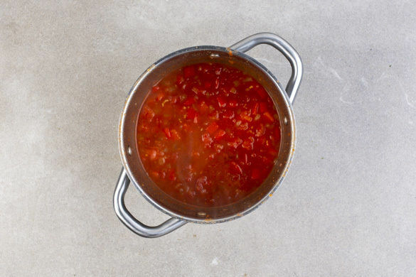 Die Paprika und die Zwiebeln in einem mittelgroßen Topf mit 1EL Olivenöl bei mittlerer Hitze 1–2Min. farblos anschwitzen. Den Knoblauch hinzugeben und ca. 1Min. mitbraten. Mit 200ml Wasser ablöschen, die ½ des Brühgewürzes unterrühren und alles einmal aufkochen lassen.