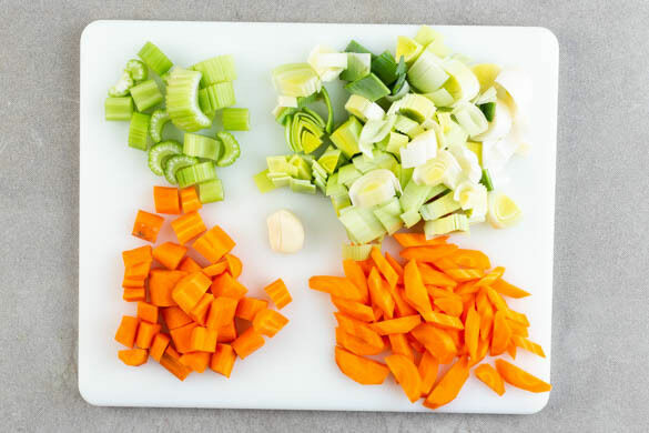 Den Backofen auf 220°C (200°C Umluft) vorheizen. Den Lauch jeweils längs halbieren und quer in ca. 1cm dicke Scheiben schneiden. Den Sellerie in ca. 2cm große Stücke schneiden. Den Knoblauch schälen. Die Karotten ggf. schälen und längs halbieren, dann die ½ der Karotten schräg in dünne Scheiben, die übrigen Karotten in ca. 1cm große Würfel schneiden.