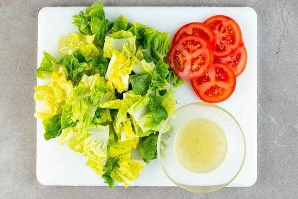 Den Salat in mundgerechte Stücke schneiden. Die Tomaten in dünne Scheiben schneiden. Aus 2EL Olivenöl, 1EL Essig und je 1 Prise Salz, Pfeffer und Zucker ein Dressing anrühren.
