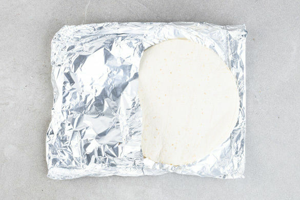4 Tortillas aufeinanderstapeln, in Alufolie einwickeln und 3–4Min. im Ofen erwärmen.