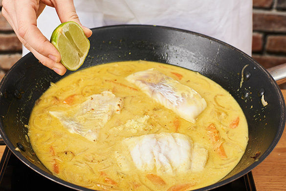 Den Fisch kalt abspülen, trocken tupfen und in 2–3cm große Stücke schneiden, dabei evtl. vorhandene Gräten mit einer Pinzette entfernen. Den Fisch mit Salz und Pfeffer würzen und so in das Curry legen, dass der Fisch von Sauce bedeckt ist. 2–3Min. bei niedriger Temperatur garen. Tipp: Der Fisch ist gar, wenn er leicht zerfällt, wenn man ihn mit einem Löffel drückt.