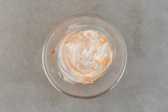 Die Crème fraîche mit der Gewürzmischung verrühren und mit ½TL Salz würzen.