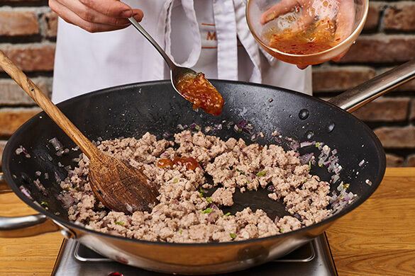 Das Hackfleisch, die Zwiebelwürfel und die Basilikumstiele mit 1TL Pflanzenöl in einer mittelgroßen Pfanne bei mittlerer Hitze 3–5Min. krümelig anbraten. 1EL Sweet-Chili-Sauce unterrühren und mit je 1 Prise Salz und Pfeffer würzen.