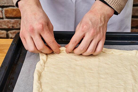 Den Teig mit dem Papier nach unten auf einem Backblech ausrollen und an den Rändern ca. 1cm breit nach innen umklappen.