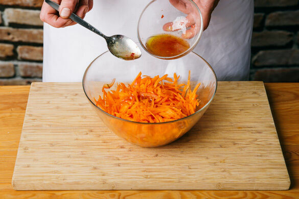 1EL Sweet-Chili-Sauce mit 1TL Pflanzenöl, 1TL Essig und je 1 Prise Salz und Pfeffer zu einem Dressing verrühren.