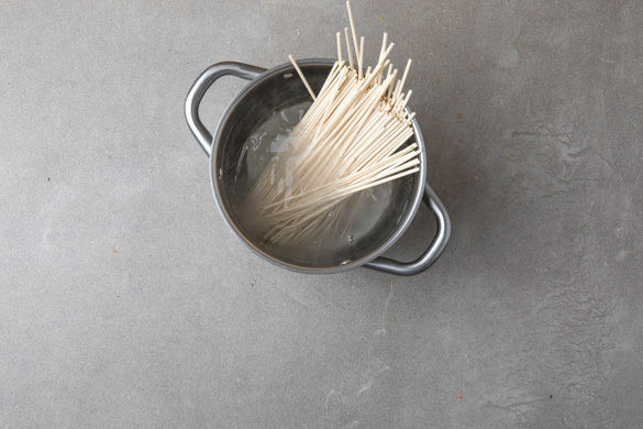 In einem mittelgroßen Topf ausreichend gesalzenes Wasser für die Nudeln zum Kochen bringen. Die Nudeln in das kochende Wasser geben und in 4–6Min. bissfest kochen. Ca. 1 Tasse Nudelwasser abschöpfen, dann die Nudeln in ein Sieb abgießen und mit kaltem Wasser abspülen.