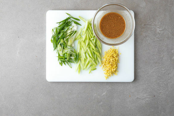 Den Ingwer schälen und fein würfeln. Den Sellerie längs halbieren und schräg in feine Streifen schneiden. Die Lauchzwiebel schräg in feine Ringe schneiden. Die Limette halbieren und auspressen. Die Erdnussbutter, das Sesamöl, 2TL Limettensaft, die ½ der Sojasauce oder mehr nach Geschmack und 1EL Ketjap Manis mit 1EL Pflanzenöl verrühren.