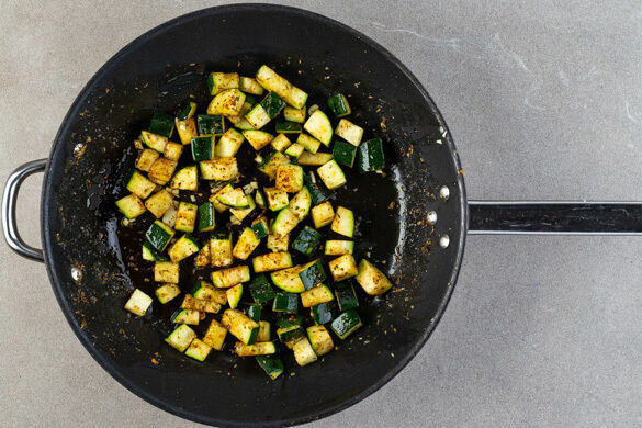 Den Backofen auf 240°C (220°C Umluft) vorheizen. In einem mittelgroßen Topf ausreichend gesalzenes Wasser für die Pasta aufkochen. Den Knoblauch schälen und fein würfeln. Die Zucchini in 1–2cm große Würfel schneiden und mit dem Knoblauch in einer großen Pfanne bei starker Hitze mit 1EL Olivenöl, der ½ der Gewürzmischung sowie je 1 Prise Salz und Pfeffer ca. 2Min. anbraten.