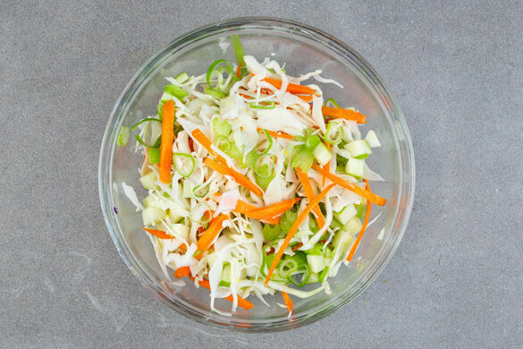 Den Limettensaft mit 1EL Pflanzenöl, 1EL hellem Essig, 1½TL Zucker und ½TL Salz verrühren, bis sich Salz und Zucker auflösen. Die Karotte ggf. schälen und grob raspeln. Mit dem Weißkohl in das Dressing geben und 1–2Min. gut durchkneten, bis das Gemüse weich wird.