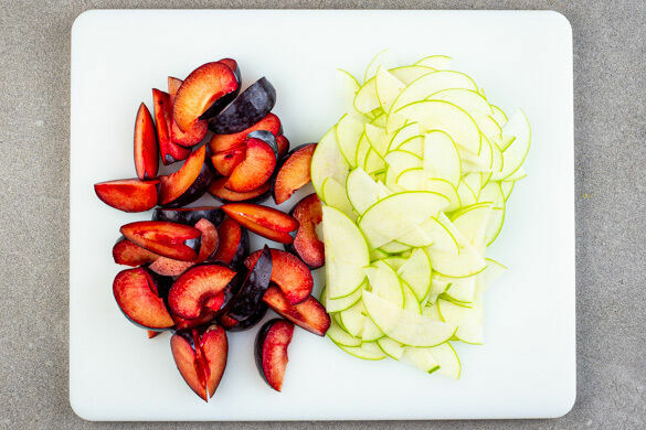 Die Pflaumen vierteln und entsteinen, dann die Viertel noch mal halbieren. Den Apfel vierteln, entkernen und in dünne Scheiben schneiden.