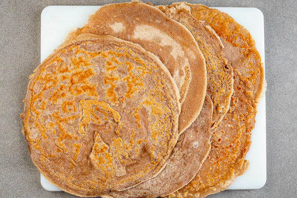 In derselben Pfanne 1TL Butter oder Pflanzenöl bei mittlerer Hitze schmelzen. Den Boden der Pfanne mit einer dünnen Schicht Teig bedecken und diesen 1–2Min. backen. Anschließend wenden und noch mal 1–2Min. backen. Auf einem Teller warm halten und so fortfahren, bis der gesamte Teig verbraucht ist. Ggf. mehr Butter oder Öl in die Pfanne geben. Der Teig ergibt etwa 6 Crêpes.