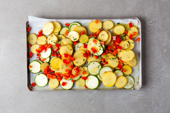 Die Paprika, die Zucchini, die Kartoffeln und die Zwiebeln auf einem mit Backpapier ausgelegten Backblech mit dem Rosmarin sowie 2EL Olivenöl vermengen und mit Salz und Pfeffer würzen. Das Gemüse gleichmäßig verteilen und 15–20Min. im Ofen backen, bis es an den Rändern zu bräunen beginnt und gar ist.