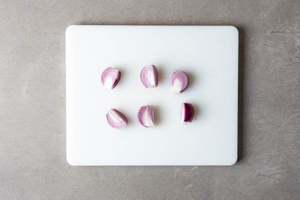 Die Zwiebel schälen, halbieren und jede Zwiebelhälfte in 3 Spalten schneiden.