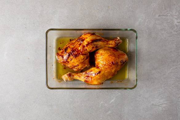Den Backofen auf 250°C (230°C Umluft) vorheizen. Das Fleisch trocken tupfen, dann mit 2EL Olivenöl einreiben und mit je 1 kräftigen Prise Salz und Pfeffer würzen. In eine Auflaufform geben und 30–35Min. im Ofen backen, bis das Fleisch goldbraun und gar ist.