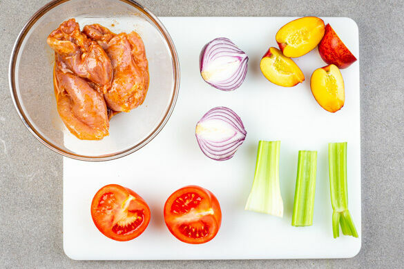 ½TL Paprikapulver, 1EL Honig, 1EL Olivenöl, 1EL Essig und ½TL Salz verrühren. Das Fleisch trocken tupfen und mit dem Würzöl vermengen. Die Nektarine vierteln, dabei den Stein entfernen. Die Zwiebel schälen und halbieren. Die Tomate ebenfalls halbieren. 1 Stangensellerie in 3 Stücke schneiden.